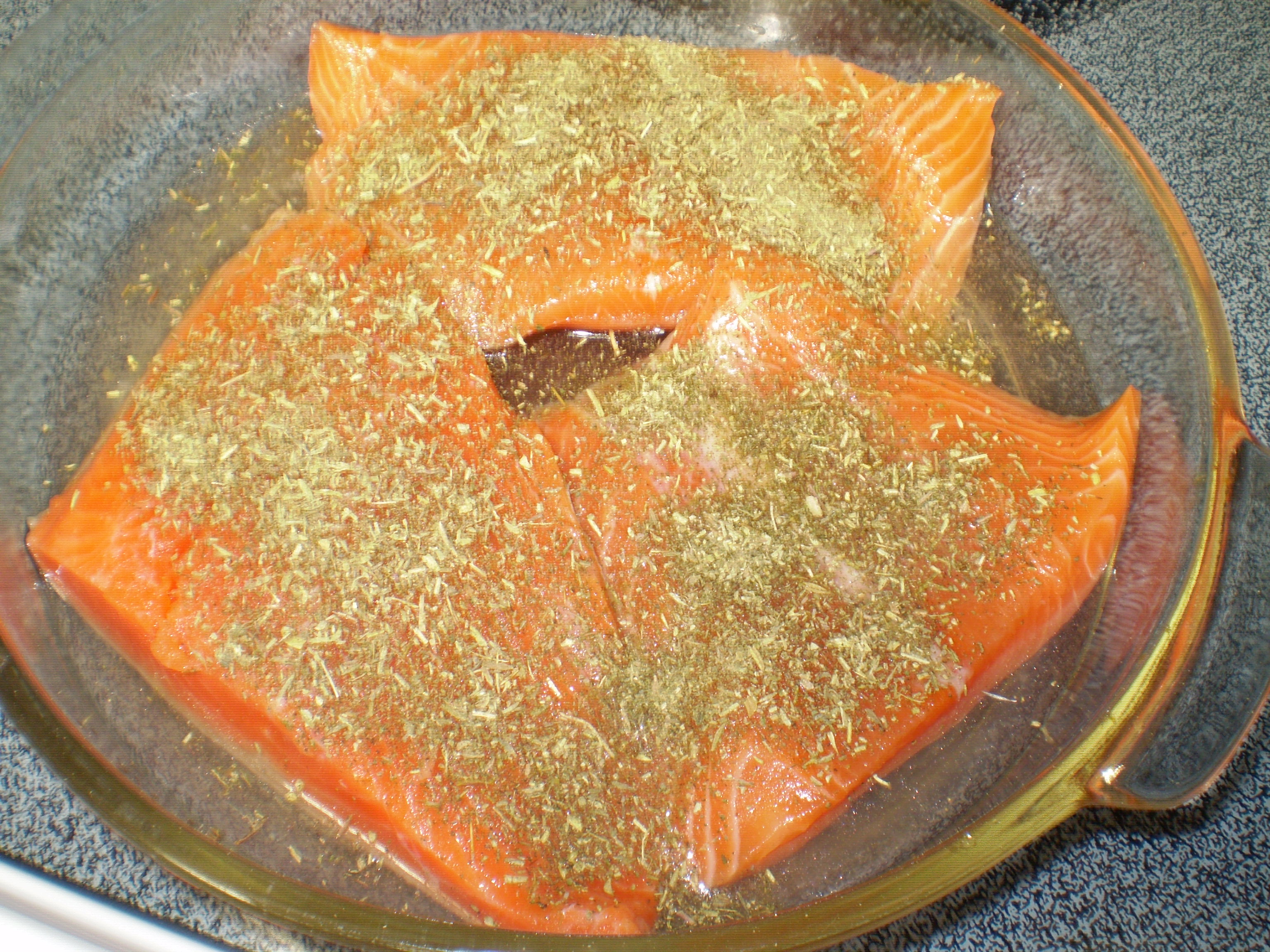 Since the salmon and chicken will need different cooking times, I use two 9×9 baking dishes. Since most of the liquid bases are acidic (I guess you could use water?), I try to use glass or ceramic baking dishes, but if I have to use a metal one (because everything else is dirty), then I am careful to line it with aluminum foil so that the acid doesn’t leech anything out of the metal and into my food.