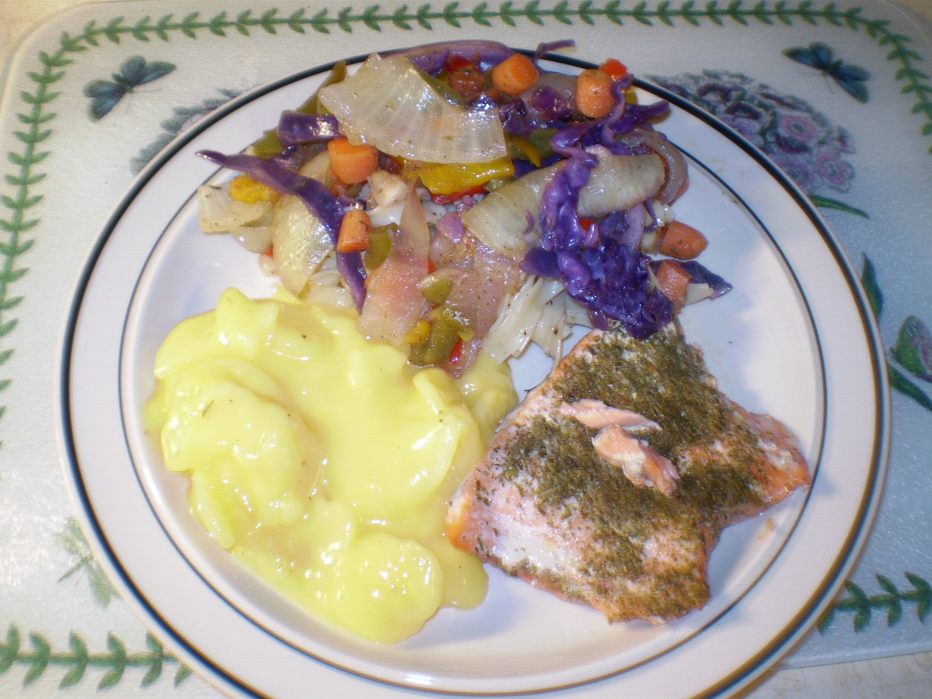 • For me: salmon, potatoes au gratin, and veggies and noodles