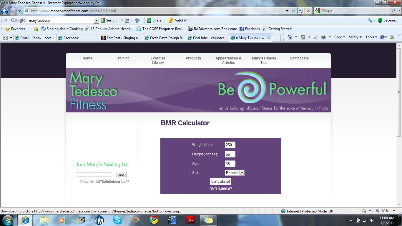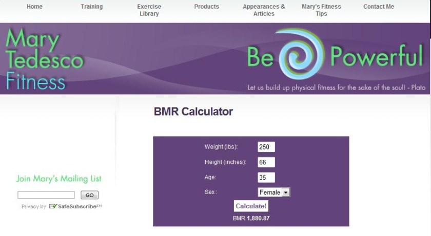 What do you need to know to make the right choices? Geez, that is so easy a caveman can do it. You need to know how many calories your body’s metabolism requires each day to keep you alive and perform basic activity functions. Yes, there is a complex mathematical formula for this. Yes, it looks very cool when all the proper symbols are aligned. No, there is NOT going to be a math test. It’s as simple as clicking on this link to a calulator for your Basil Metabolic Rate. Enter your current weight (be shockingly honest), your height, your age, and your sex. Mine comes out like this: