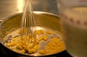The ratio describes the number of tablespoons of butter compared to the number of tablespoons of flour. Then you’ll add the number of cups of liquid (equal parts milk and water) to result in the number of cups of finished gravy. The liquid gets you the mass, while the butter-flour mixture (sometimes called a roux) gets you the thickness (photo from RisingWolfEats.blogspot.com).