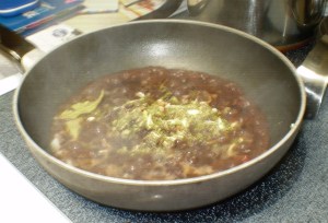 Saute on medium high the veggies, garlic, and pepper til soft (or carmelized if you like that), dump in beans, sugar, spices, and splashes. Stir well and simmer on medium low until the fish is done.