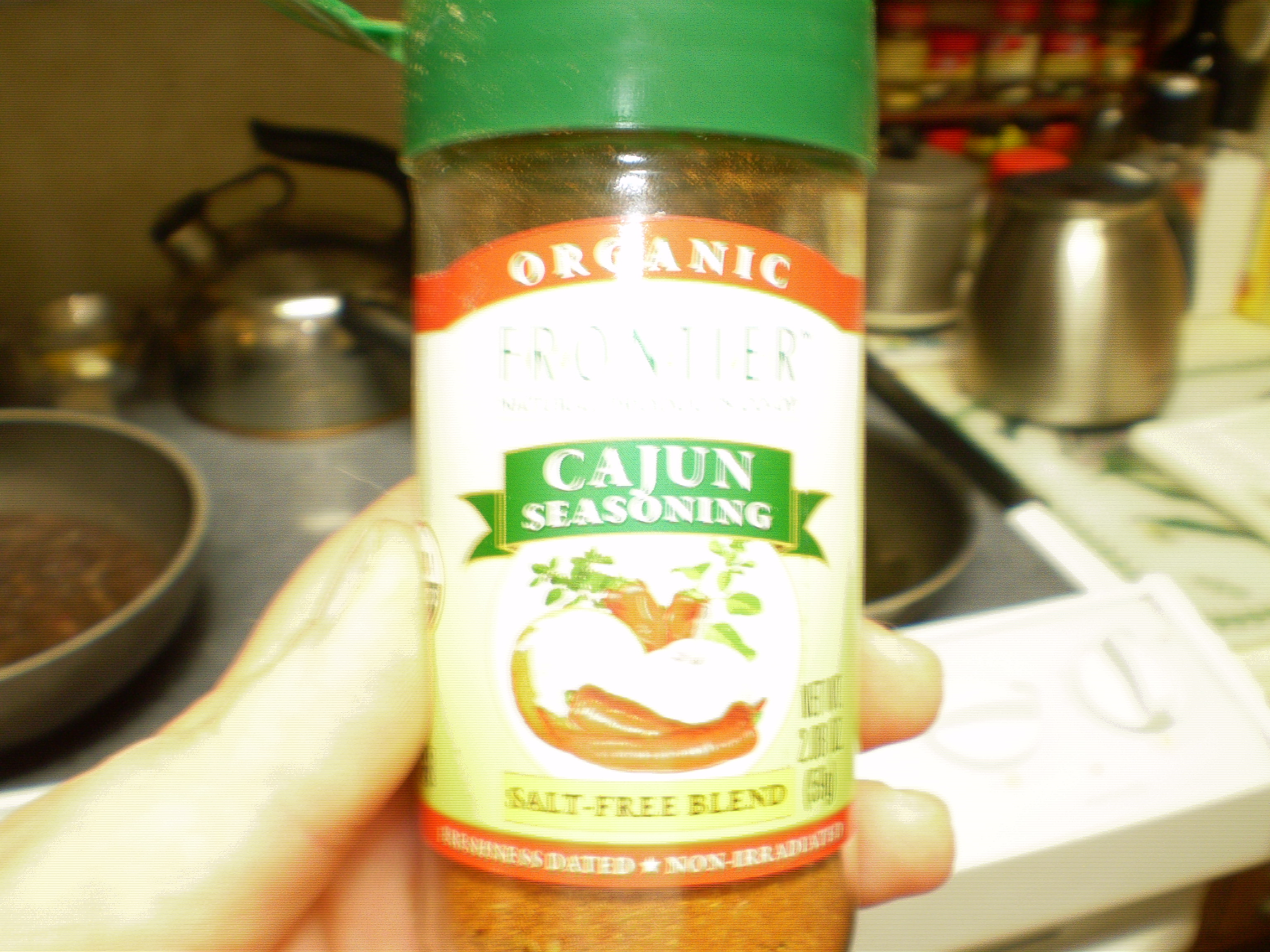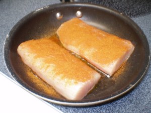 Once the beans have gone into the simmer stage, season the fish liberally on both sides. My family likes the Frontier Organic Cajun Seasoning, which we find at Whole Foods. Sear on high on each side for about 3 minutes each; if your fish is thick, then it won’t be quite done in the middle (if you cut it with a fork it’ll still be grey and translucent). I like to pour in about 1/4 cup fruit juice (pineapple tonight since it was leftover from a can I ate earlier today) and “poach” on high for about a minute; pour out the juice and continue cooking til the fish is very firm when poked (no give or bounce). When I use a spicy seasoning, I like to use a sweet fruit juice to give the dish some balance so the heat isn’t so overwhelming.