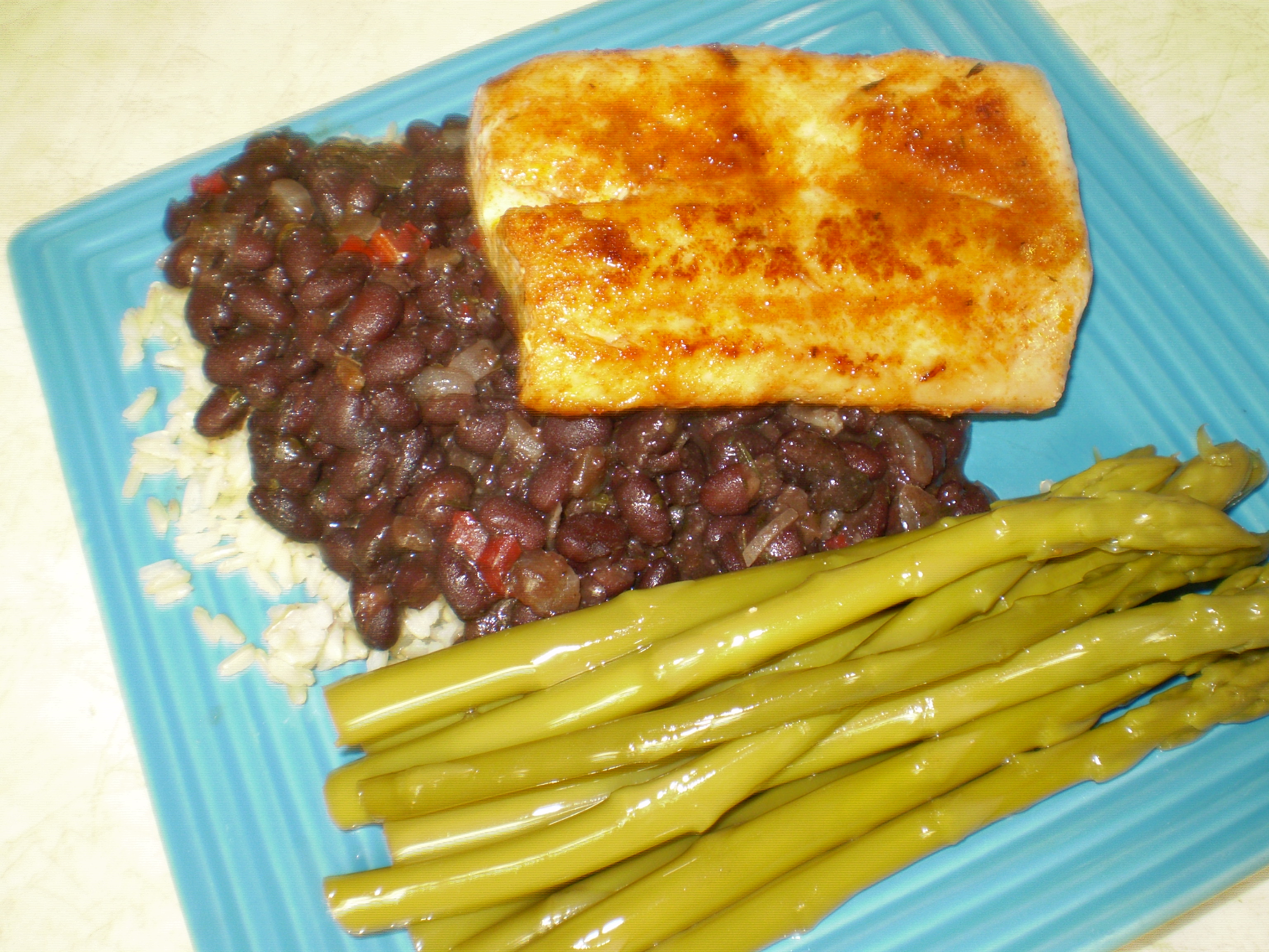 Tonight, though, is Wednesday. And Wednesdays are for fish in my house. Family pick for tonight: mahi mahi. So now I have to figure out what to do. In an unusual twist, I pick the side first: black beans and rice, paired with spicy cajun mahi mahi and pickled asparagus. The earthy sweetness of the beans with the spice of the fish with the tang of the pickled asparagus make for a wonderful “party in your mouth”!
