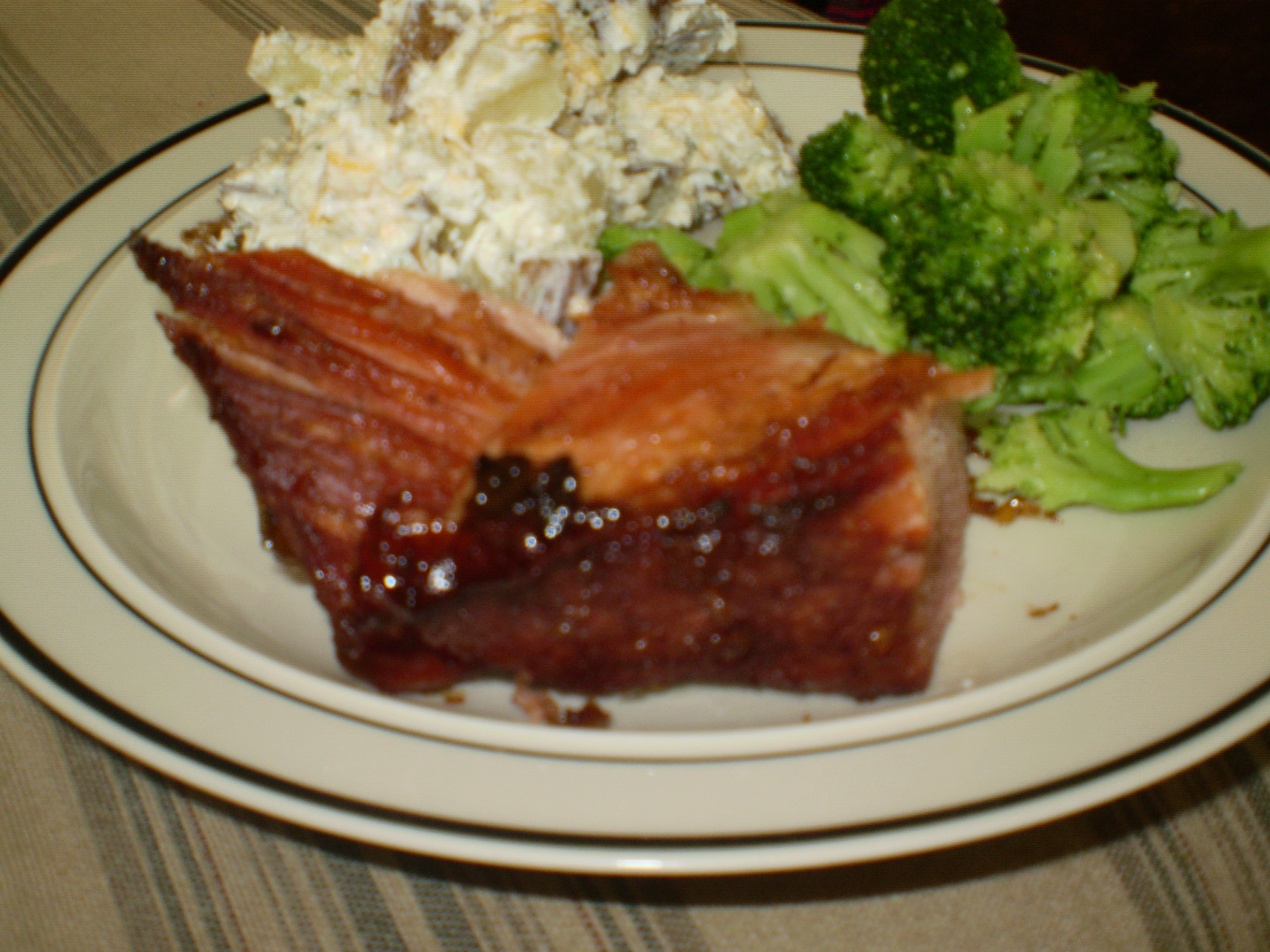 Paired with this sweet and spicy ham is a baked potato salad and steamed broccoli.