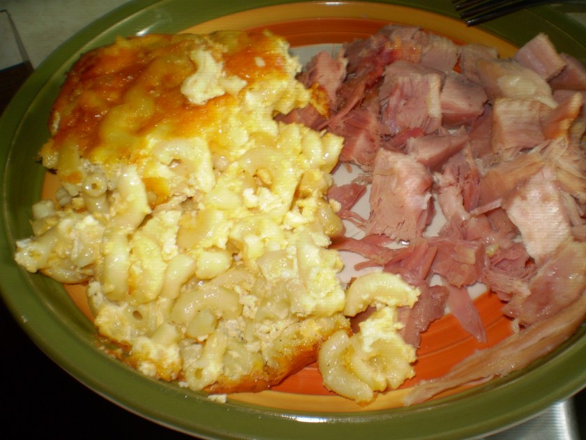 Macaroni Pie is a classic southern dish that is traditionally served as a side dish with anything at all: chicken, bbq, ham, steak…probably not fish or seafood, though. It can also be easily transformed into a complete meal casserole with the substitution of half of the cooked pasta for meat and vegetables; I’m fond of chicken and broccoli, myself.