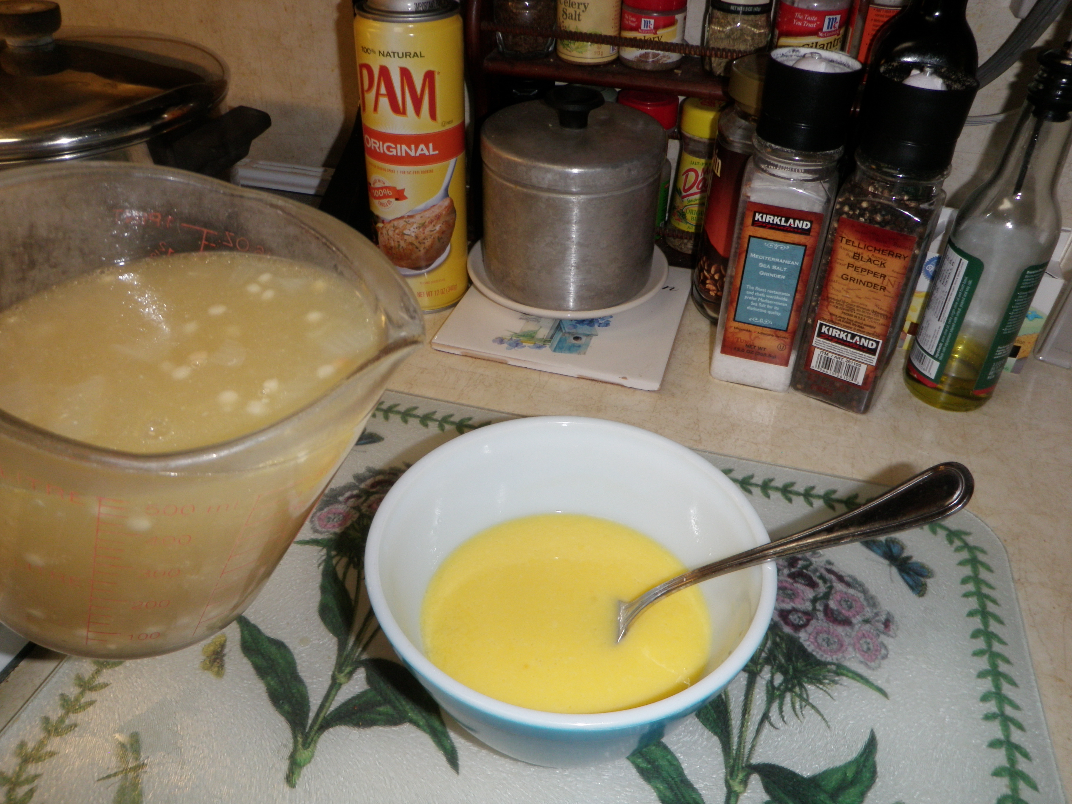 Get 2 cups of hot broth out of the soup pot; it’s okay if there’s some onion or couscous in it. I dip the broth out with a soup ladle and into a large measuring cup with a pour spout. This will come in really handy as I pour it into the egg mixture.
