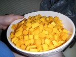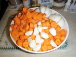 Get all the veggies cleaned and cut. I usually do this while watching a movie, a method I “developed” from my days living in a tiny Brooklyn flat with no kitchen counters. If you’re using fresh ginger, peel, dice, and add that to the roasting mix.