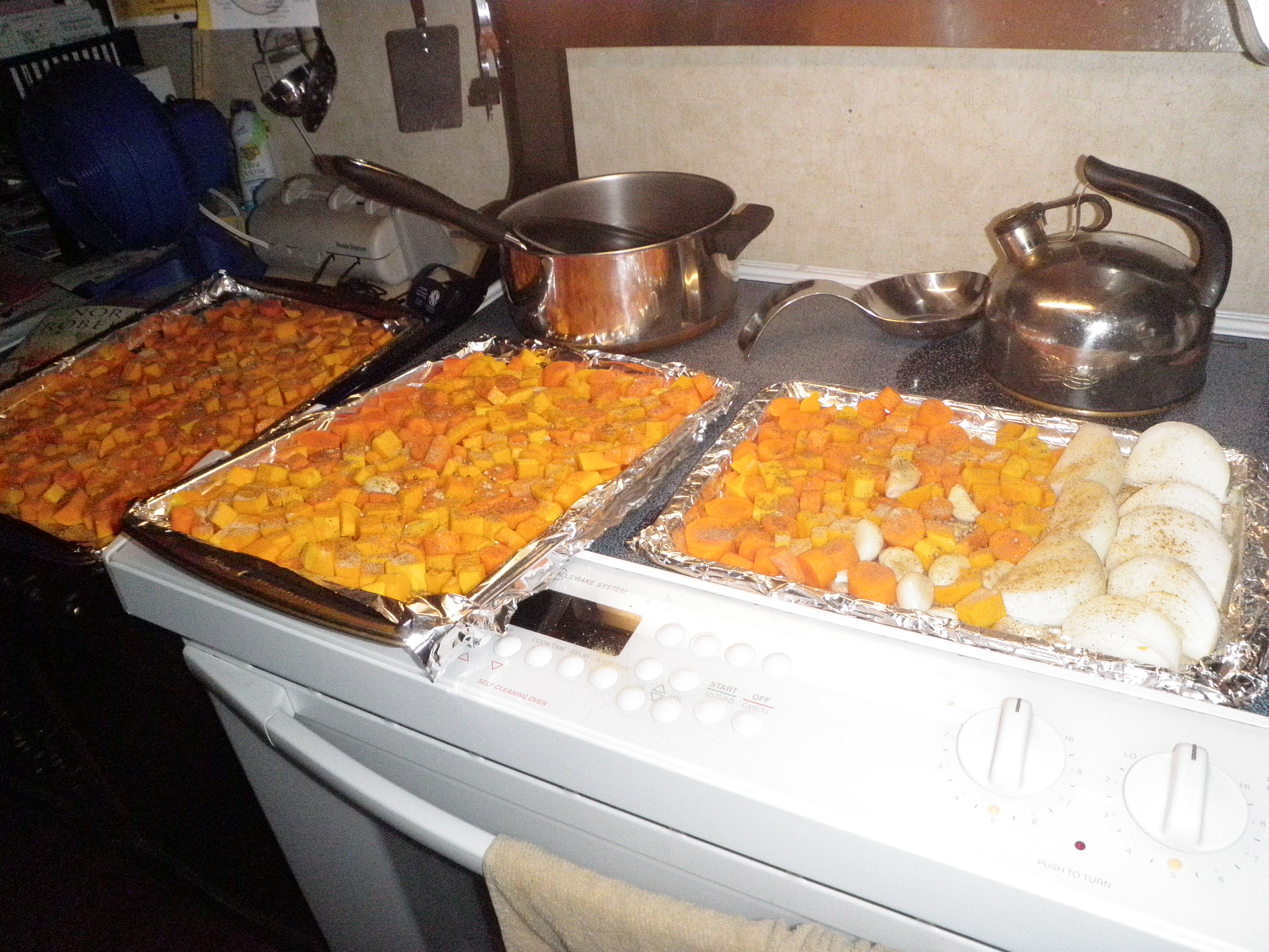 Spread them all out on cookie sheets, making sure everything is in just one layer. Dust with salt, pepper, and spices; use as much or as little as you like. Roast at 400°F for 45 minutes. Turn off the oven and let them sit for another 15 minutes.