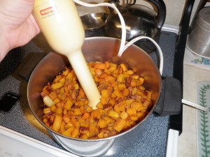 If you’ve watched chefs on cooking shows make soup, you’ve seen the two methods: blender or immersion wand. Both can achieve the same level of smoothness, but the traditional blender will get you there faster; just make sure the veggies have cooled to room temperature before using the traditional blender. Me, I like the convenience of the immersion wand because I can pretty much put all of the veggies in at one time and both see and feel the consistency as I’m blending; it offers a level of control that you don’t get with the traditional blender.
