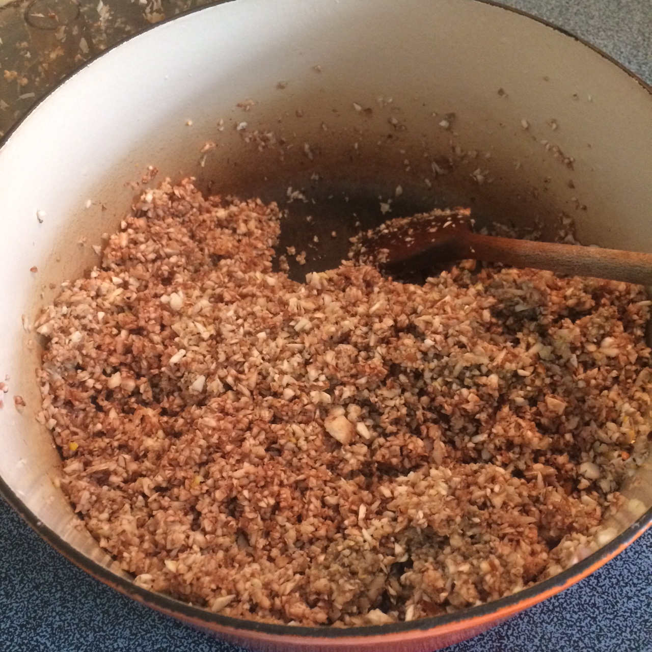 Finely chop the mushrooms in your food processor (Cuisinart). If you don’t have a food processor, borrow one. You’ll thank me after your first hand-chopped or too-big-pieces batch! I find it easiest and fastest to do this in three batches, basically one batch per 8 oz container of mushrooms. Dump straight into the stock pot as you chop each batch.