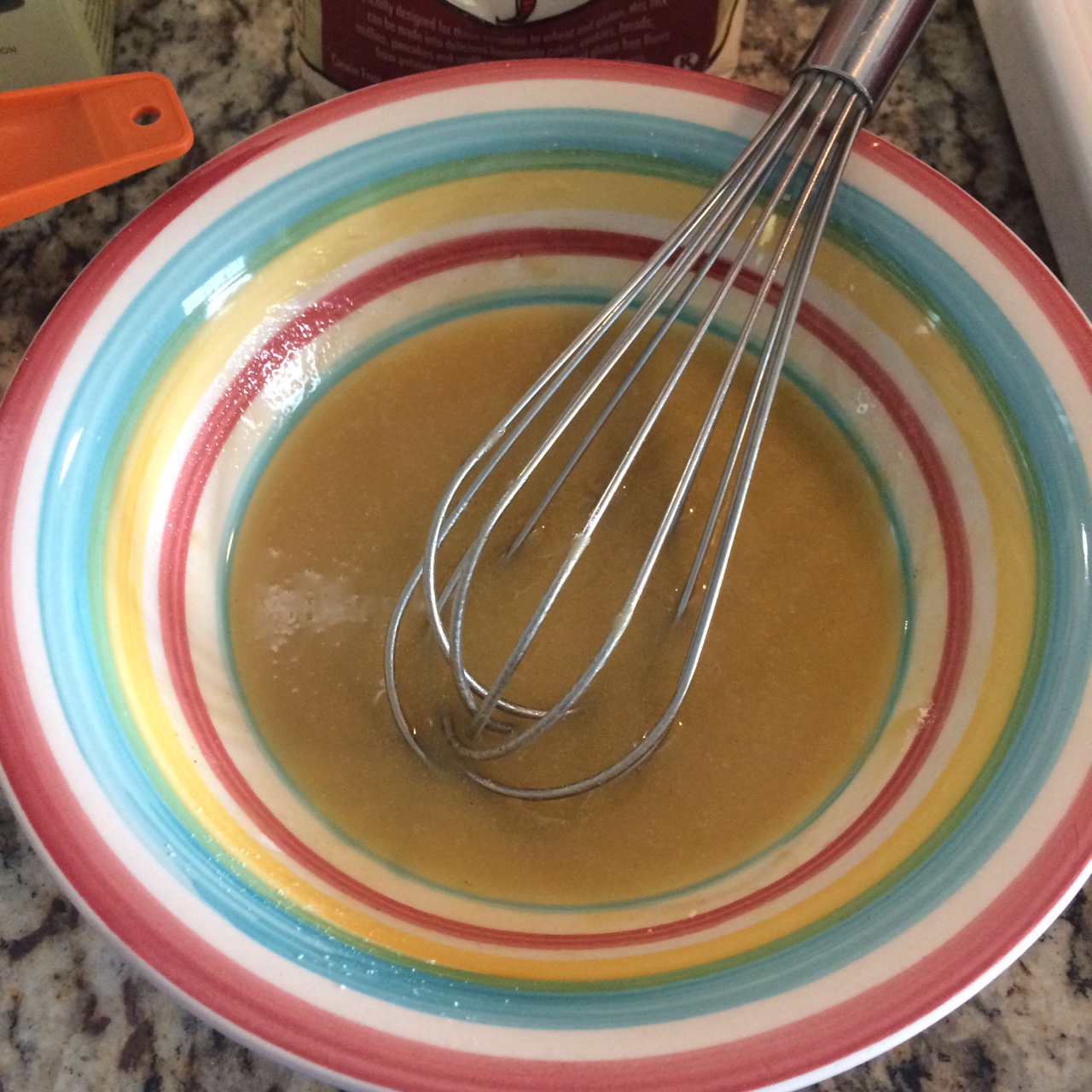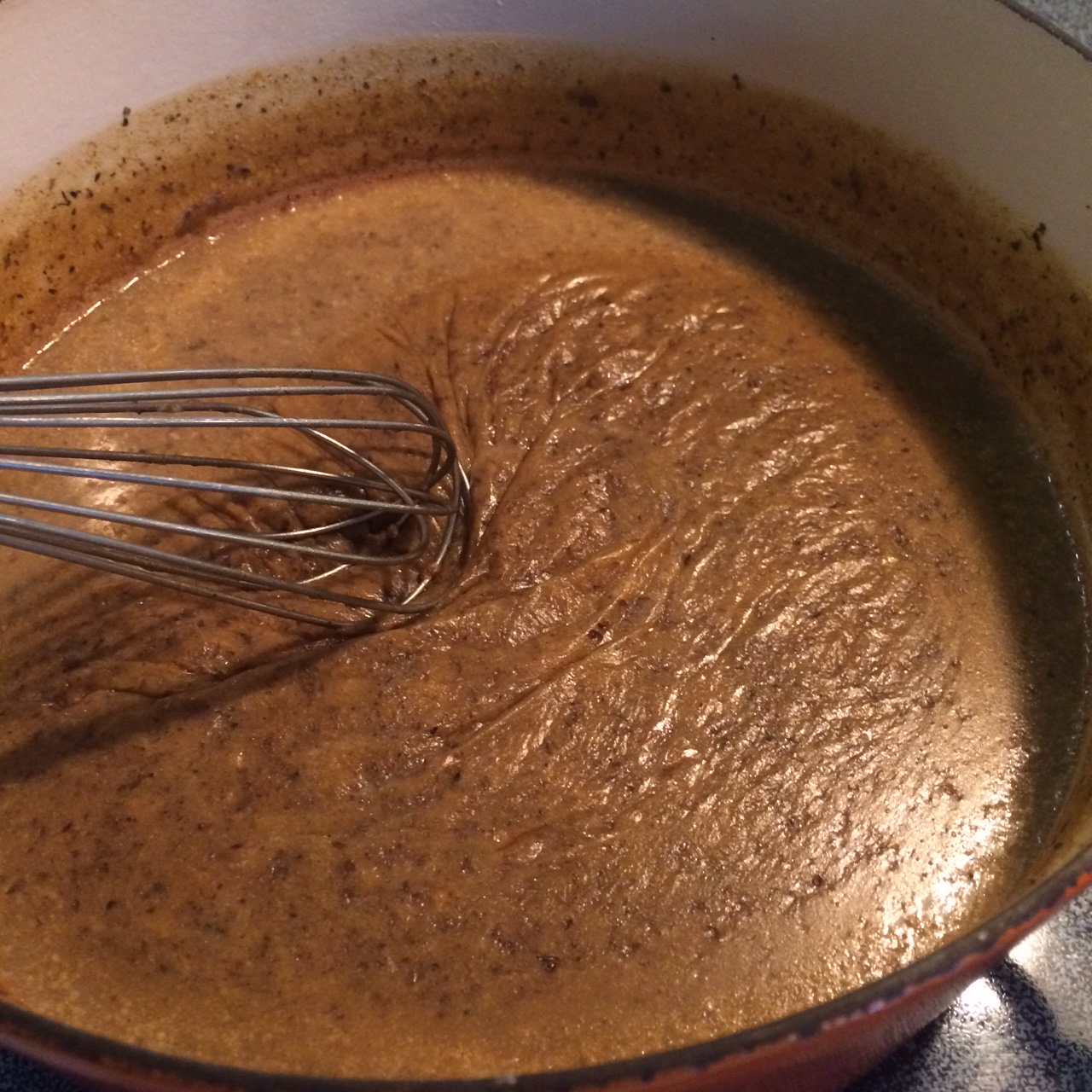 While you’re waiting for the mushroom water to cook all out, whisk together the all purpose flour and the oil; this is roux (pronounced “roo” like kangaroo), used to thicken liquids into thickened broth, cream soups or gravies. NOTE: if you find the first batch not thick enough for you, next time increase both ingredients to 1/3 cup; the more roux you use, the thicker your soup will be.