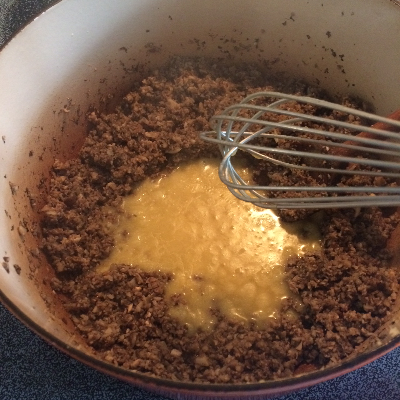 Once you’re sure all of the mushroom water is cooked out, make a hole in the mushrooms and pour in the roux. Let it bubble up for about 30 seconds and then stir it around into the mushrooms. Add the cup of milk/cream and keep stirring. It’ll look a little oatmeally at this point.