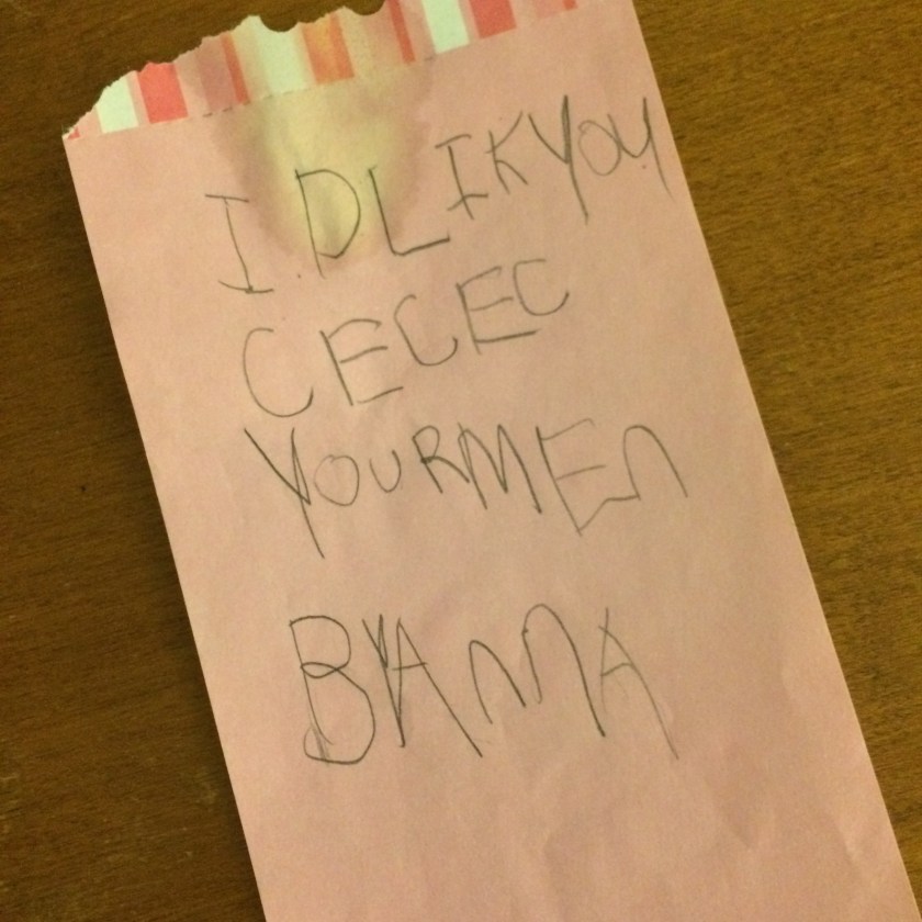 IMG_1727I’ve got a couple of notes my niece Anna has made for me. This one was for my birthday last year. It’s a pink Pecachoo and says “Happy Birthday CeCe” and has a heart on it. Do you think any of these words and pictures might be signs that Anna loves me? Yeah, the heart, and she says “Happy”. Those are great signs of love, easy to spot.