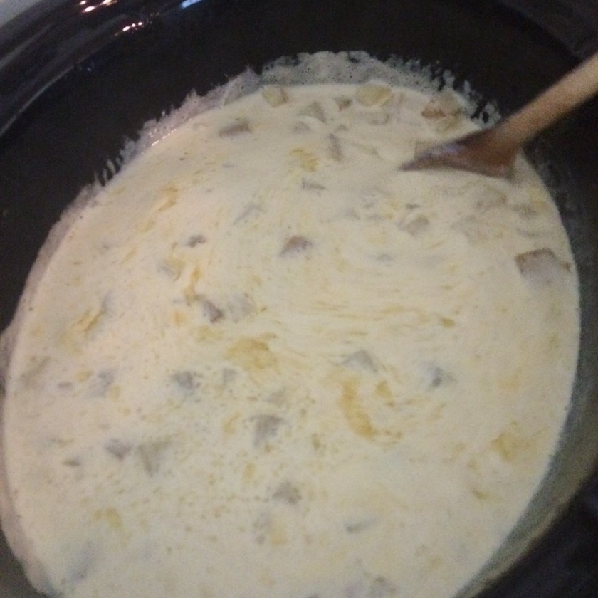 IMG_1753This is one of my favorite soups to do in the crock pot, mainly because my chicken and veggie stock are made ahead and frozen, and I can’t ever remember to thaw them out. Using the crock pot, I can put all but the heavy cream and cheese in at once and set it on Low for 6-8 hours. It takes a little more than an hour for the frozen stock to thaw and cover the potatoes and onions and cook.