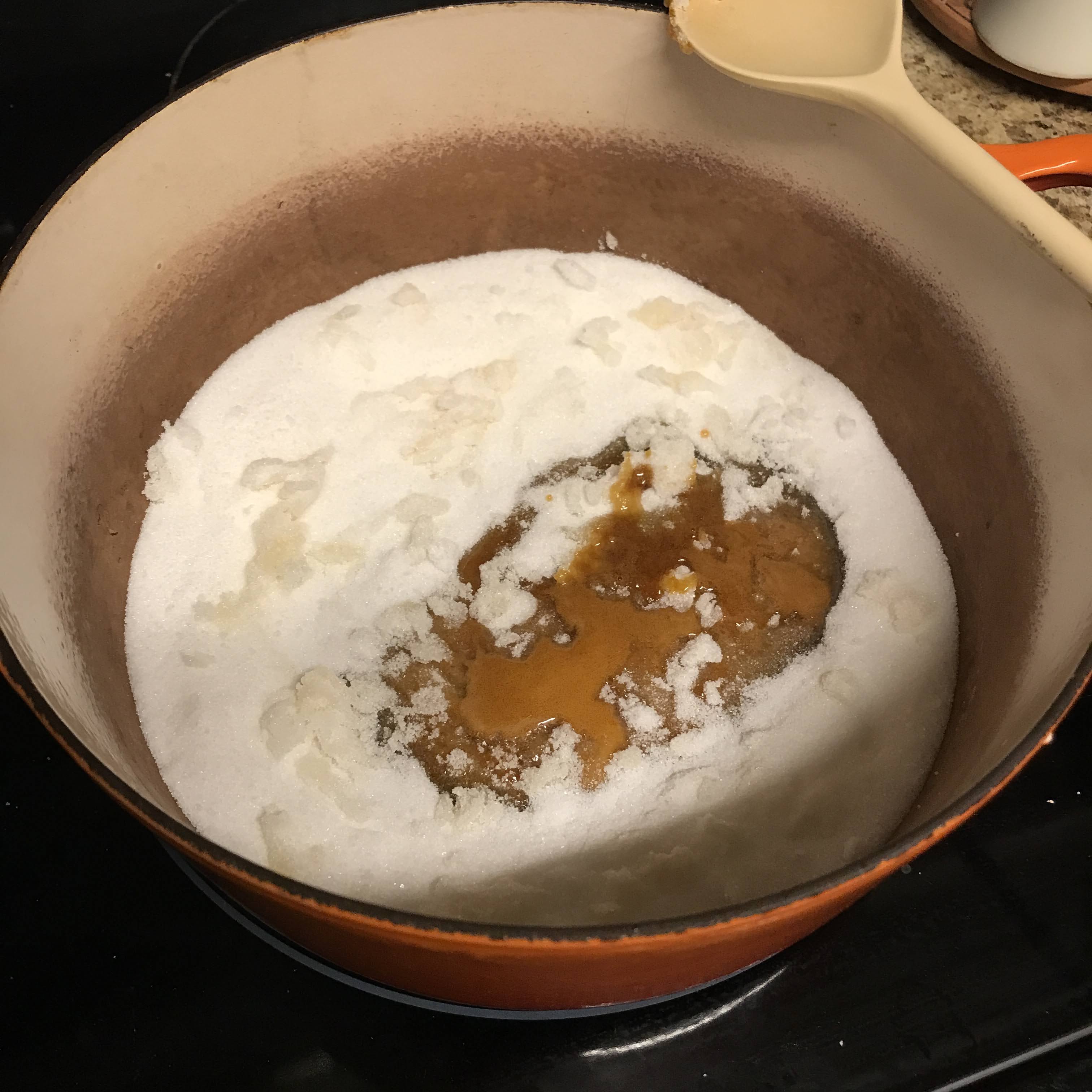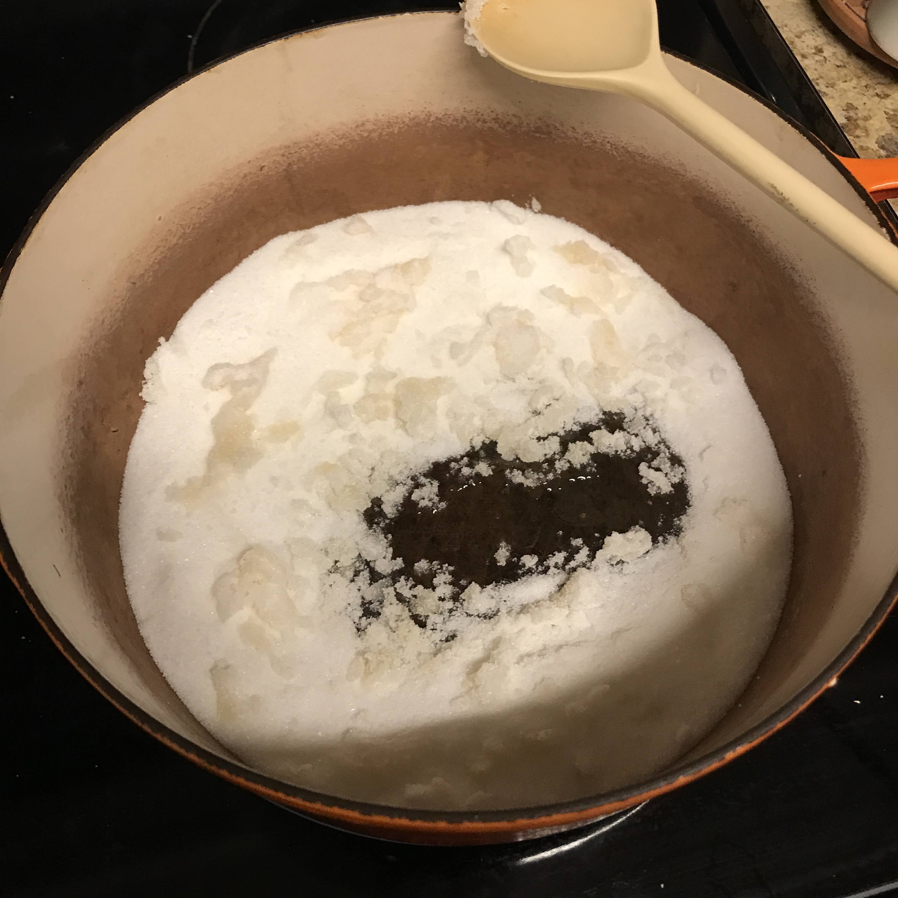 Step 2: place the pot with sugar on medium heat. WARNING: do not use higher than medium or your sugar will burn before it’s all melted, and you’ll have to dump the whole pot and start over. Now, every stove is different AND your local environment (heat and humidity) will affect the stove setting that achieves your desired level of burnt. On my electric, glass-topped stove in Winter Park, FL, exactly medium achieves my preferred dark caramel and one notch from medium towards low achieves my family’s preferred standard medium caramel.