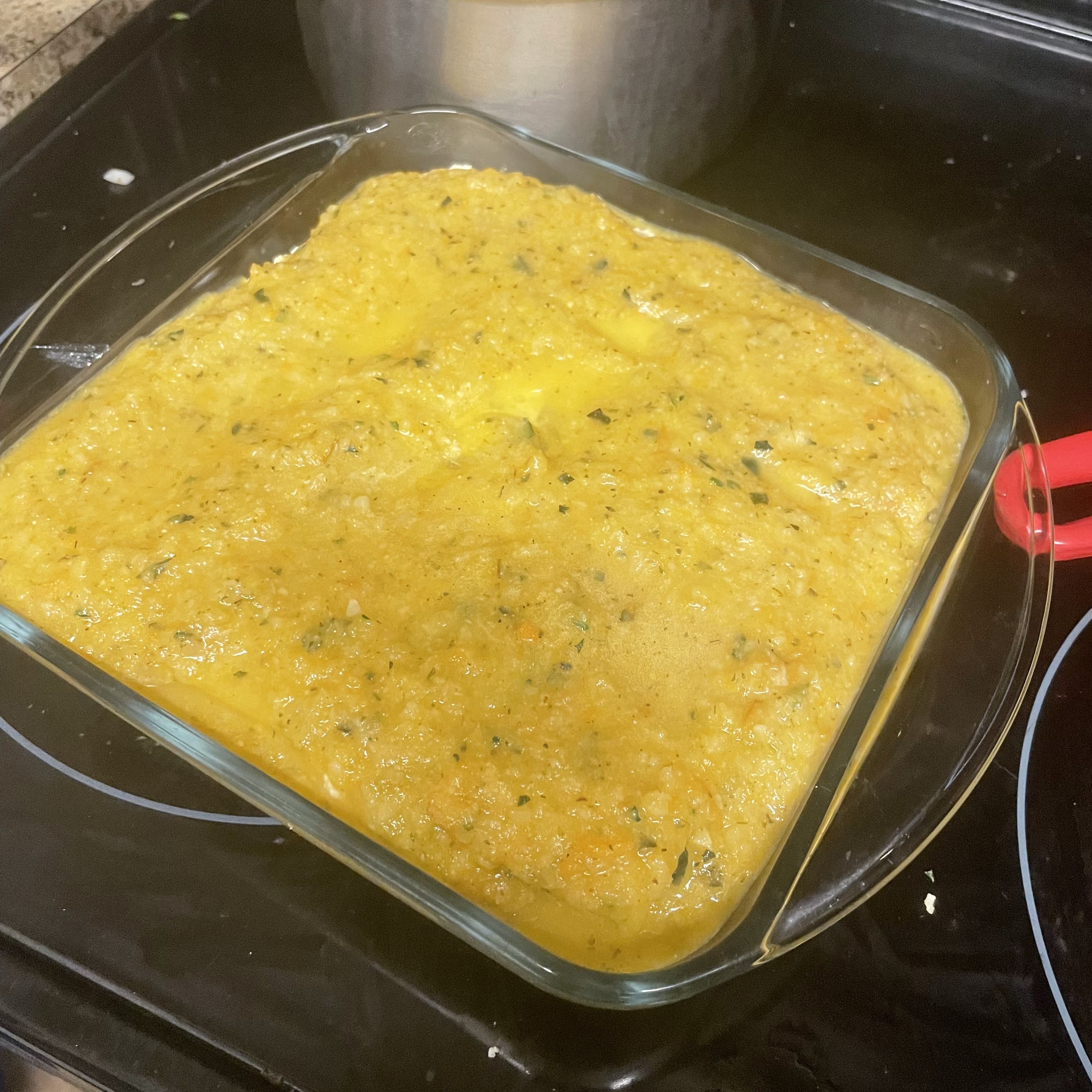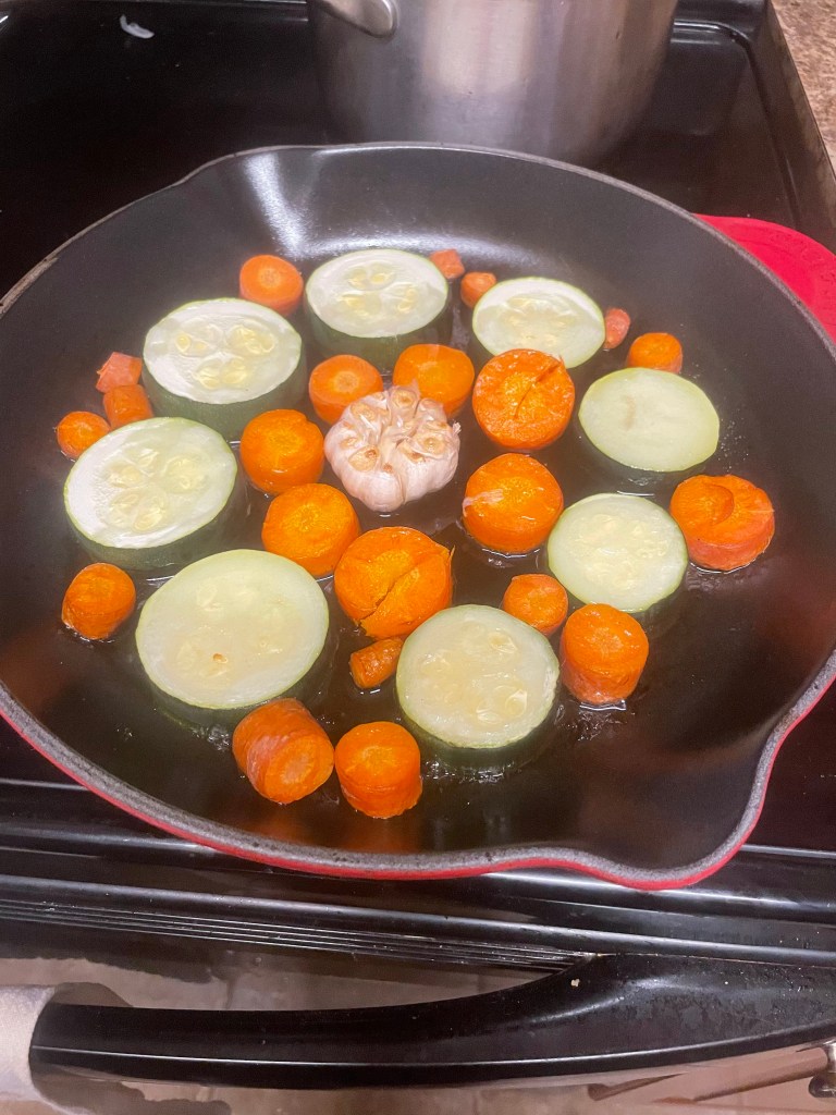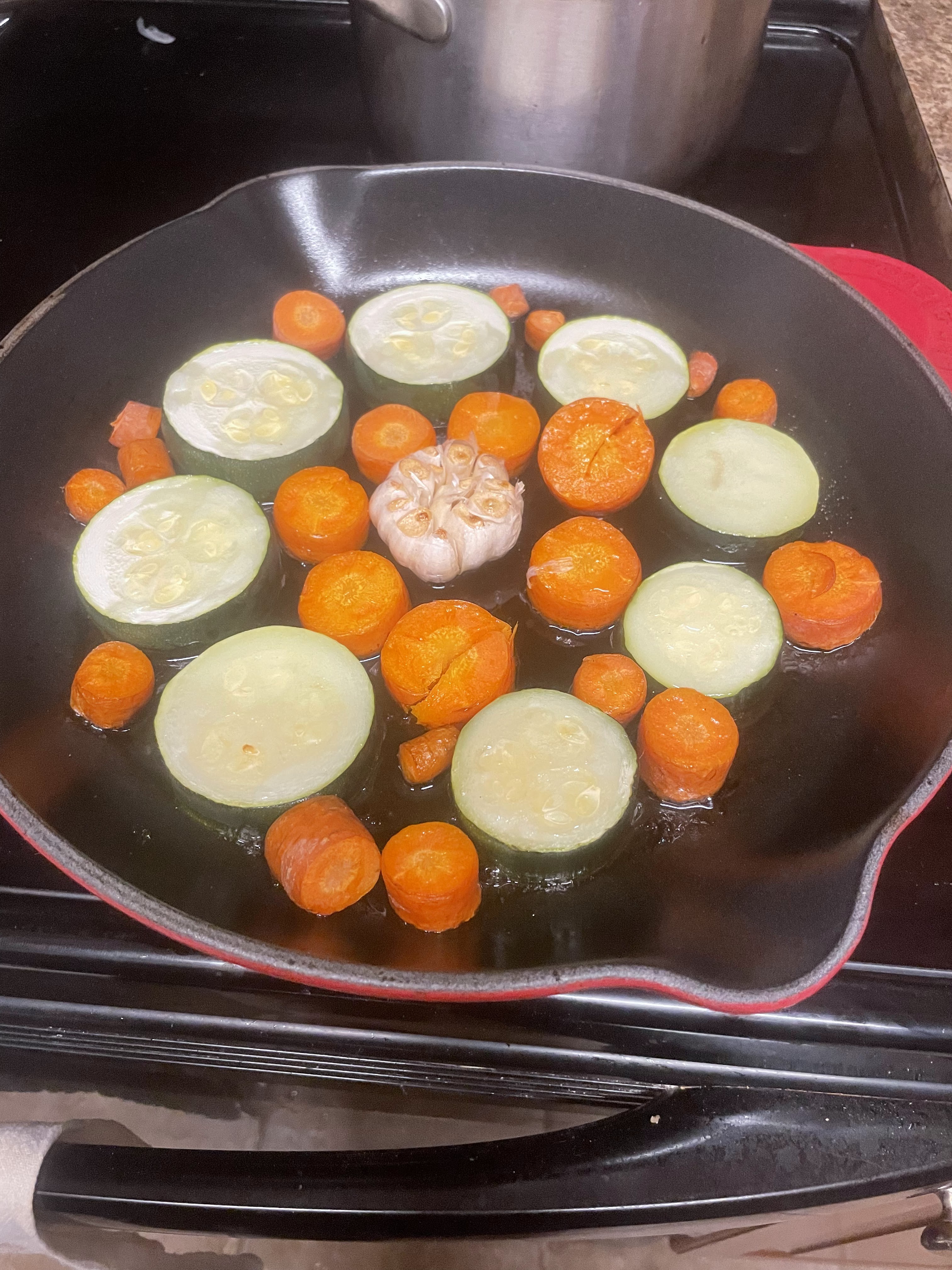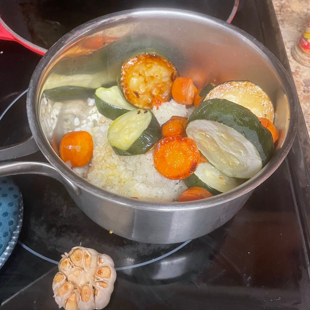 Roast the zucchini, carrots, and garlic at 350 for 45 minutes. While those are roasting, dump the frozen riced cauliflower in a sauce pan with 1 cup of the veggie stock and heat on low, mainly to thaw the cauliflower; you don’t need to “cook” anything.