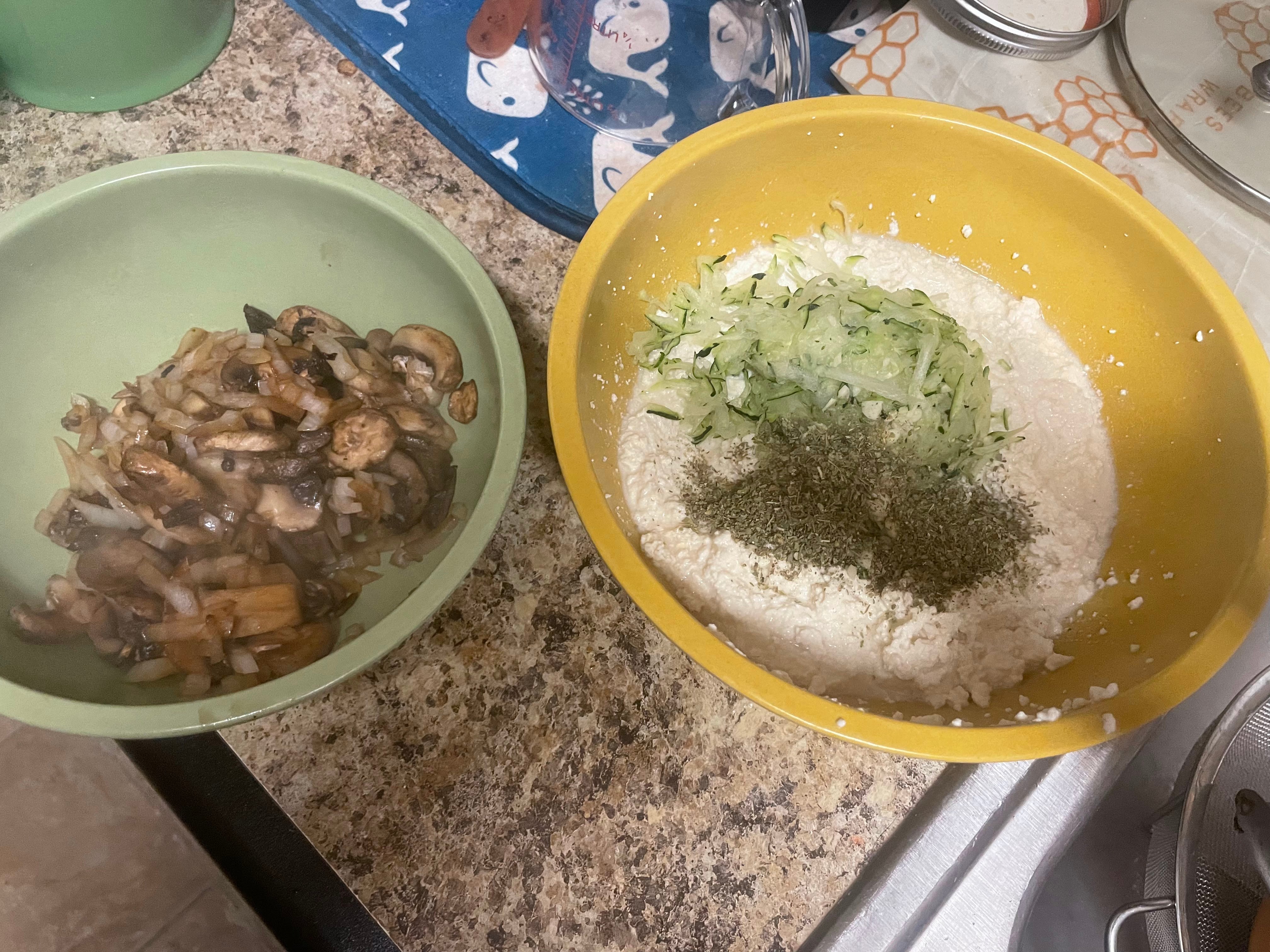 Cook the mushrooms by themselves in the same pan you roasted the ratatouille veggies in – no extra oil is needed. Once the mushrooms have browned and the water they released evaporated, move them all to the outer edge of the pan and drop in the onions. Sautee maybe 2-3 minutes more until the onions are less white and moving towards clear-ish. Scoop it all into a bowl to cool for just a minute before mixing into the tofu ricotta.