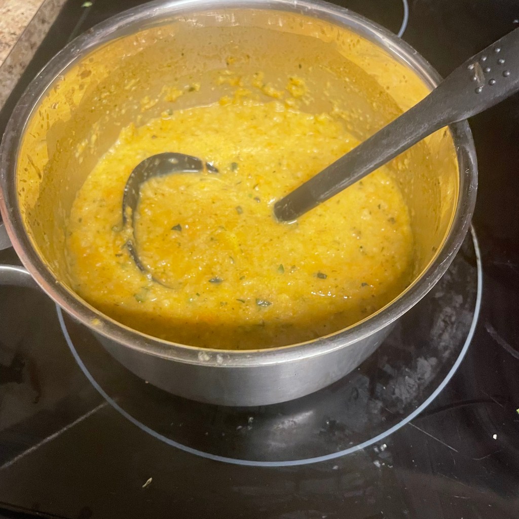 When the roasting veggies are done, add them to the sauce pan and blend with an immersion blender. Add more veggie stock as needed to get to your desired thick or thinness.