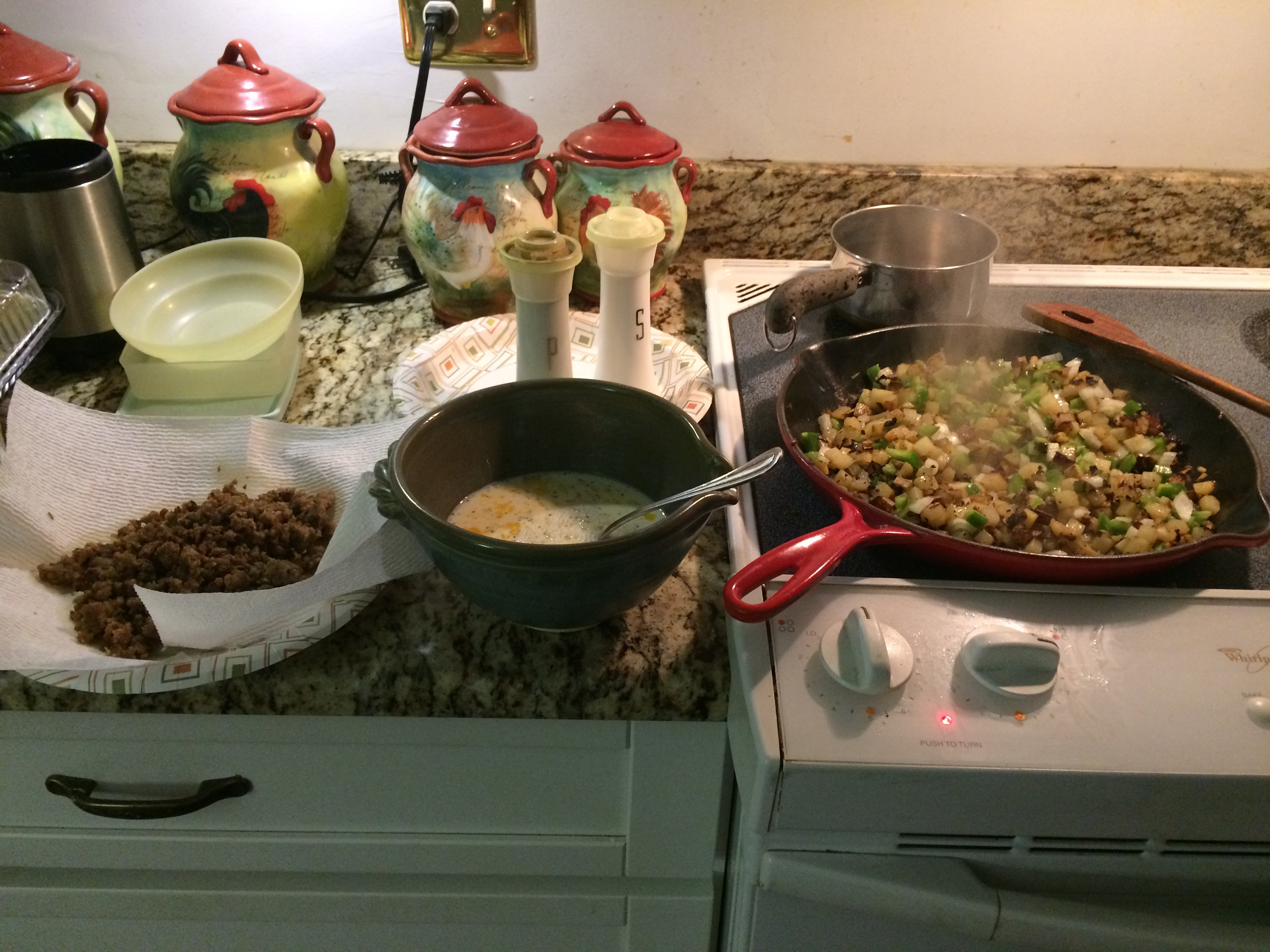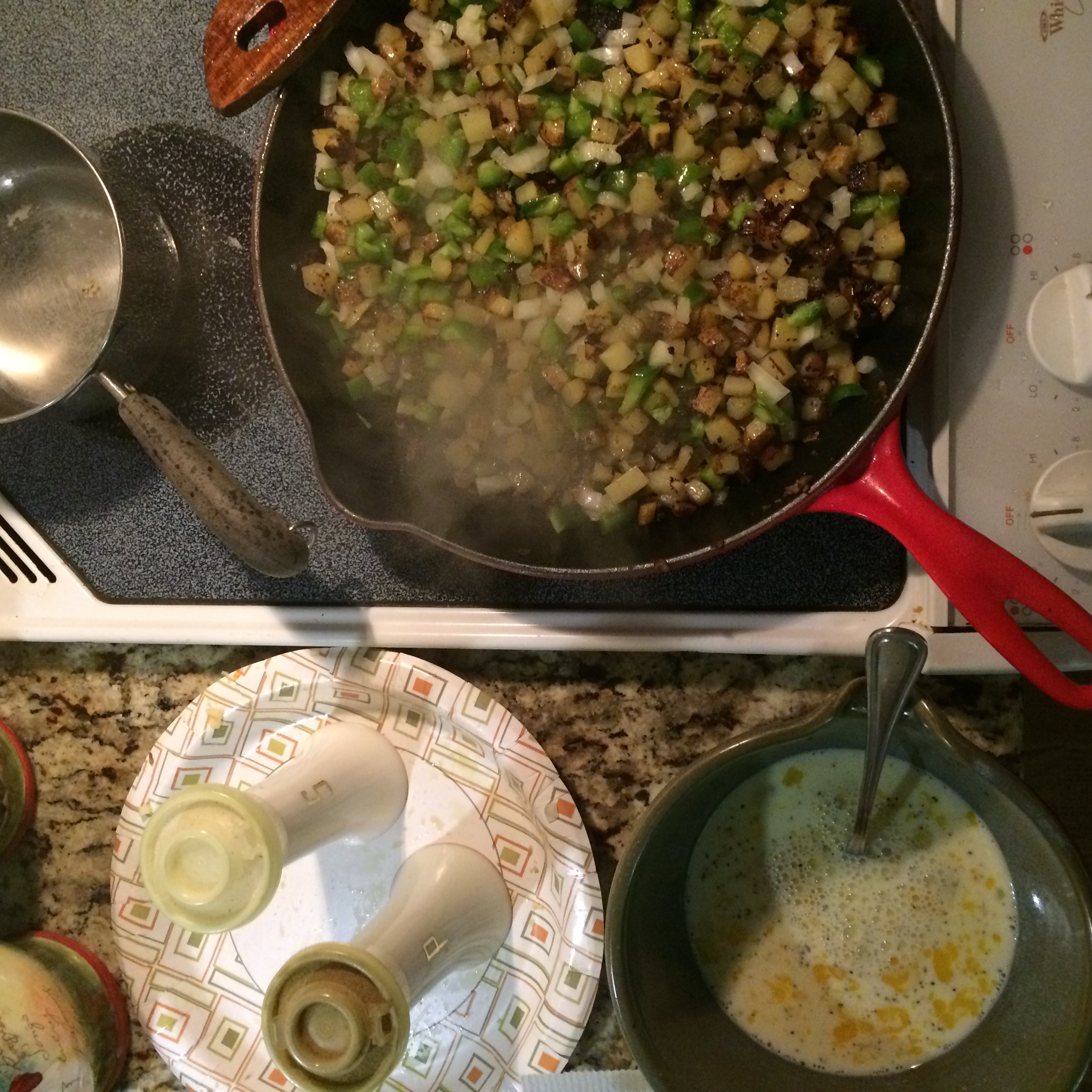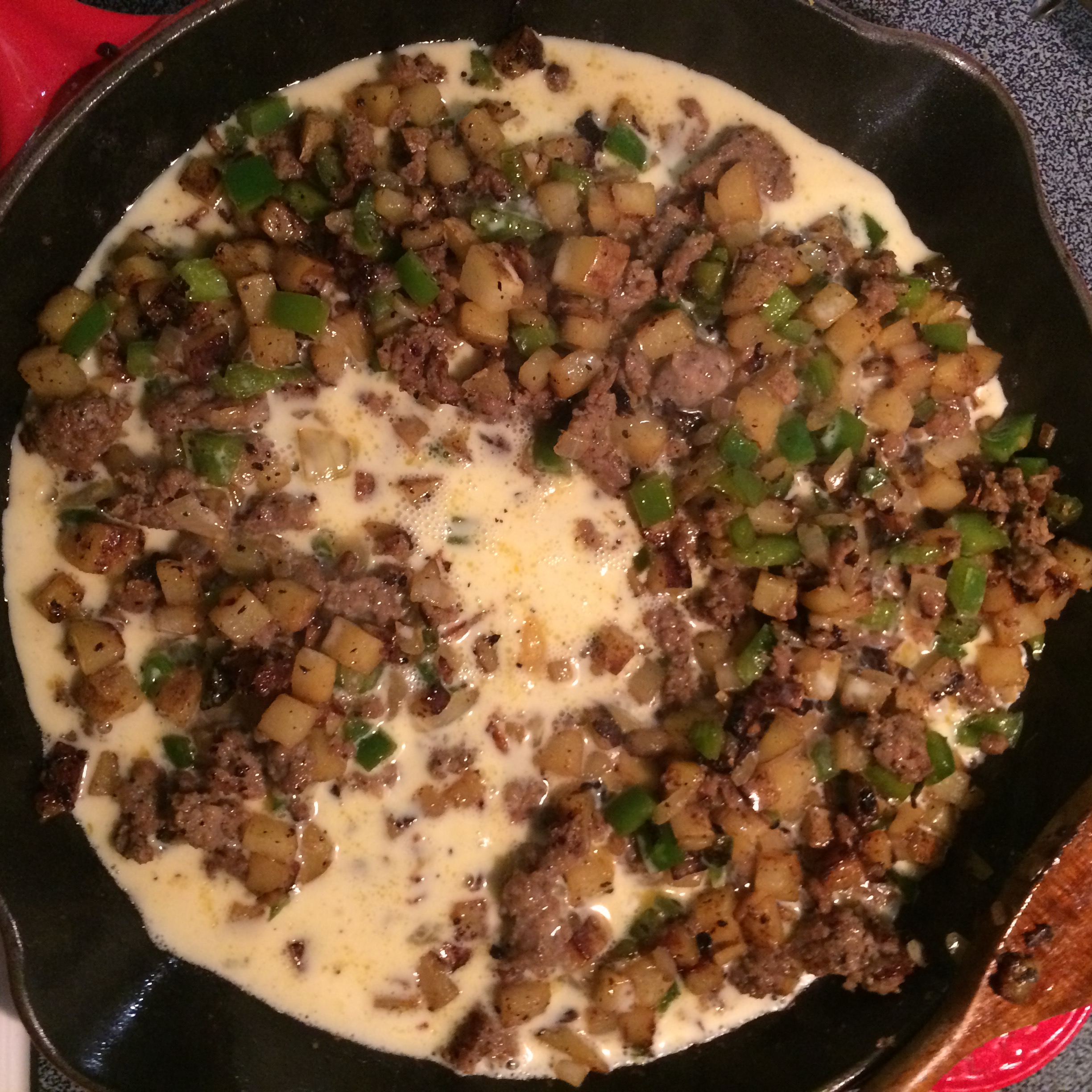 While the potatoes, onions, and peppers are finishing, scramble 3 eggs with about 2 T milk; be sure to salt and pepper your egg scramble or the eggs will be bland.