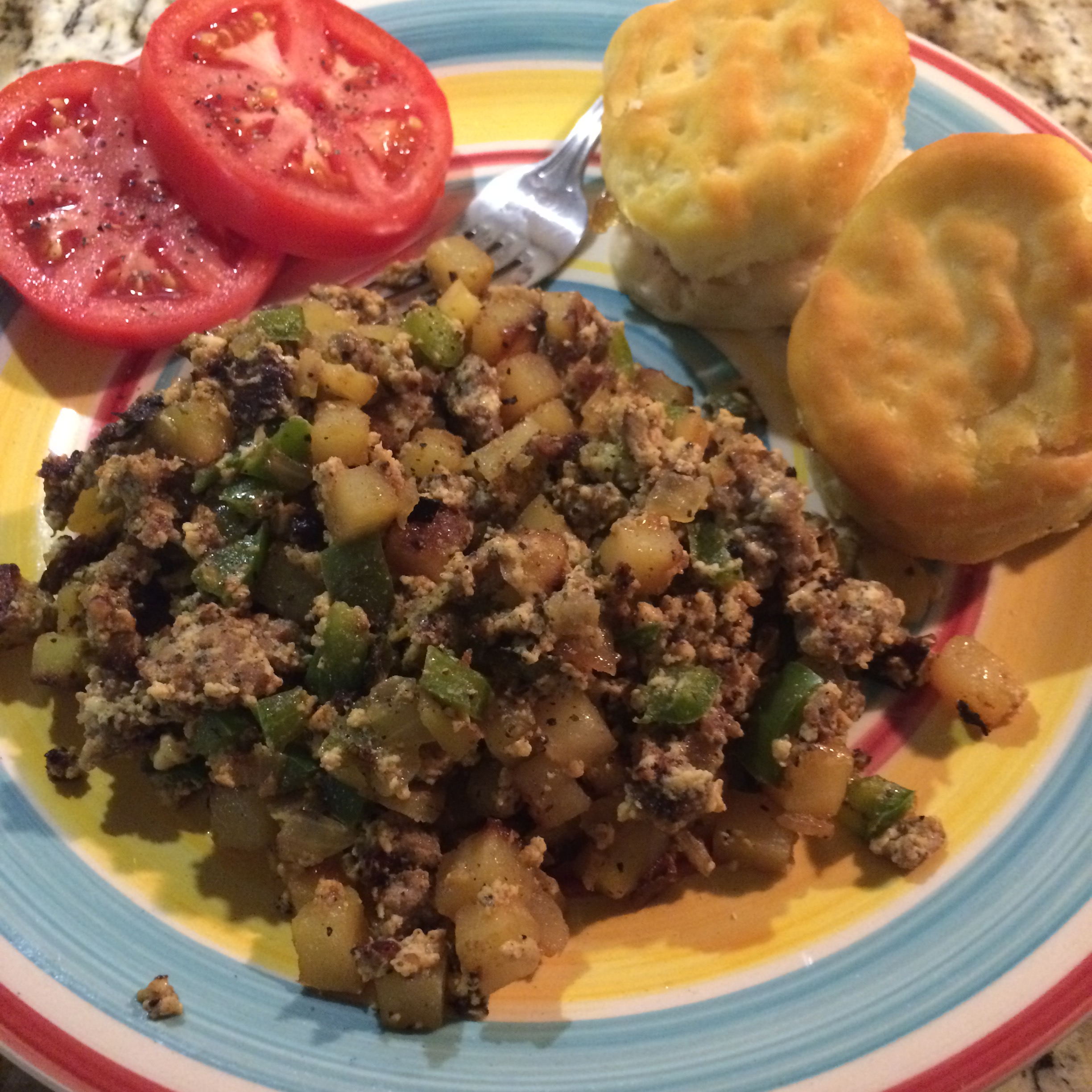 Sub veggie crumbles or seitan crumbles for the sausage (will need to use an oil for the potatoes, onion, and peppers)